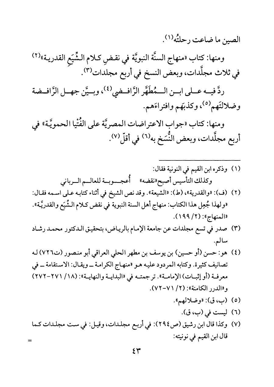 ومنها: كتاب «منهاج السنَّة النبويَّة في نقضِ كلام الشِّيَعِ القدرية» (¬٢) في ثلاث مجلَّدات، وبعض النسخ في أربع مجلدات (¬٣).