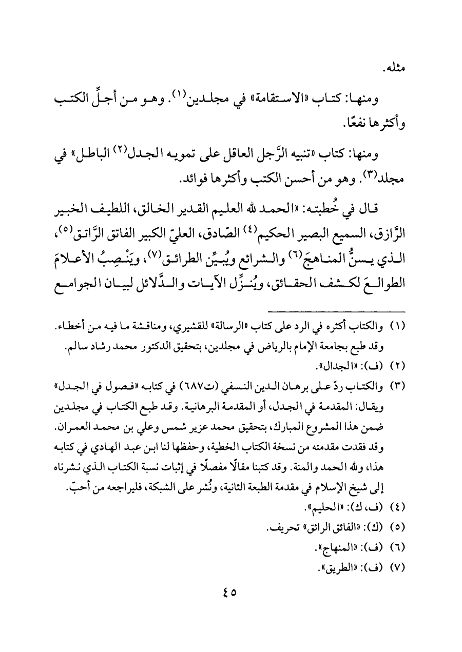 (¬٣) والكتاب ردّ على برهان الدين النسفي (ت ٦٨٧) في كتابه «فصول في الجدل» ويقال: المقدمة في الجدل، أو المقدمة البرهانية. وقد طبع الكتاب في مجلدين ضمن هذا المشروع المبارك، بتحقيق محمد عزير شمس وعلي بن محمد العمران. وقد فقدت مقدمته من نسخة الكتاب الخطية، وحفظها لنا ابن عبد الهادي في كتابه هذا، ولله الحمد والمنة. وقد كتبنا مقالًا مفصلًا في إثبات نسبة الكتاب الذي نشرناه إلى شيخ الإسلام في مقدمة الطبعة الثانية، ونُشر على الشبكة، فليراجعه من أحبّ.