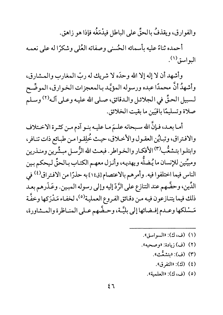 أما بعد، فإنَّ الله سبحانه علمَ ما عليه بنو آدم من كثرة الاختلاف والافتراق، وتبايُن العقول والأخلاق، حيث خُلِقوا من طبائع ذات تنافر، وابتلوا بتشعُّب (¬٣) الأفكار والخواطر. فبعث الله الرُّسل مبشِّرين ومنذرين ومبيِّنين للإنسان ما يُضلُّه ويهديه، وأنزل معهم الكتاب بالحقِّ ليحكم بين الناس فيما اختلفوا فيه. وأمرهم بالاعتصام [ق ١٤] به حذرًا من الافتراق (¬٤) في الدِّين، وحضَّهم عند التنازع على الرَّدّ إليه وإلى رسوله المبين. وعَذَرهم بعد ذلك فيما يتنازعون فيه من دقائق الفروع العملية (¬٥)، لخفاء مَدْرَكها وخفَّة مَسْلكها وعدم إفضائها إلى بليَّة، وحضَّهم على المناظرة والمشاورة،