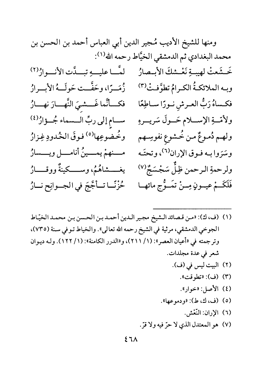 (¬١) (ف، ك): «من قصائد الشيخ مجير الدين أحمد بن الحسن بن محمد الخيّاط الجوخي الدمشقي، مرثية في الشيخ رحمه الله تعالى». والخياط توفي سنة (٧٣٥)، وترجمته في «أعيان العصر»: (١/ ٢١١)، و «الدرر الكامنة»: (١/ ١٢٢). وله ديوان شعر في عدة مجلدات.
