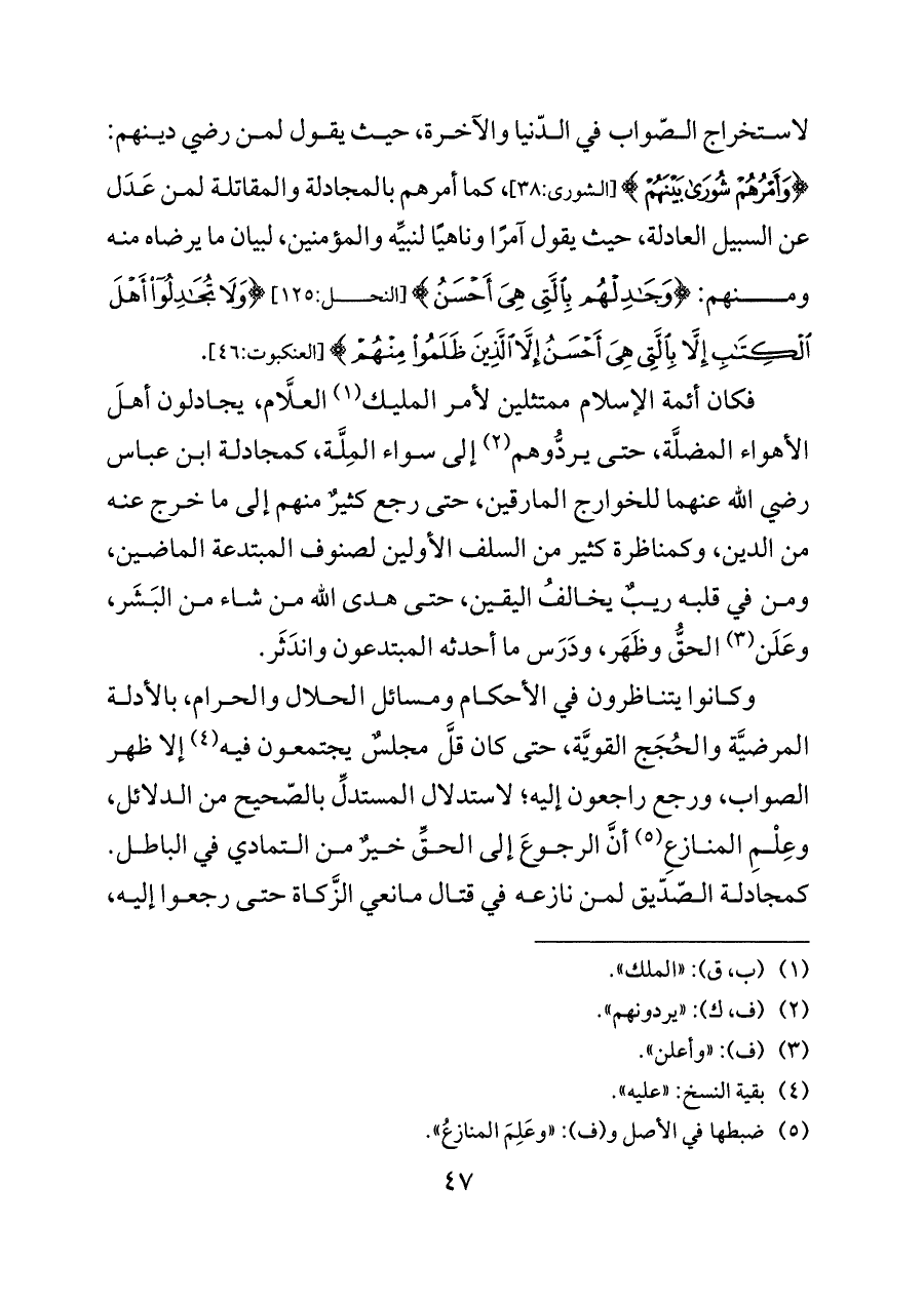وكانوا يتناظرون في الأحكام ومسائل الحلال والحرام، بالأدلة المرضيَّة والحُجَج القويَّة، حتى كان قلَّ مجلسٌ يجتمعون فيه (¬٤) إلا ظهر الصواب، ورجع راجعون إليه؛ لاستدلال المستدلِّ بالصّحيح من الدلائل، وعِلْمِ المنازعِ (¬٥) أنَّ الرجوعَ إلى الحقِّ خيرٌ من التمادي في الباطل. كمجادلة الصّدّيق لمن نازعه في قتال مانعي الزَّكاة حتى رجعوا إليه،