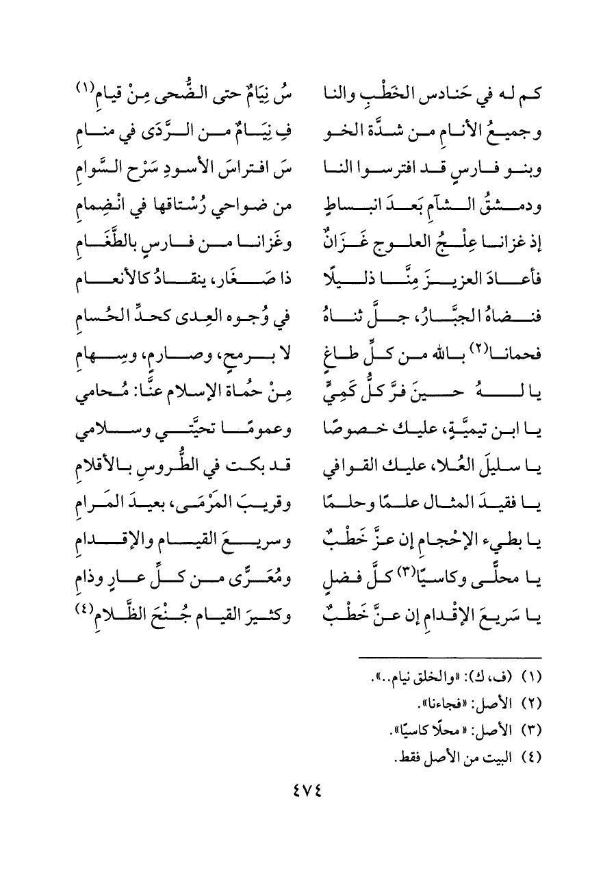 كم له في حَنادس الخَطْبِ والنا ... سُ نِيَامٌ حتى الضُّحى مِنْ قيامِ (¬١)