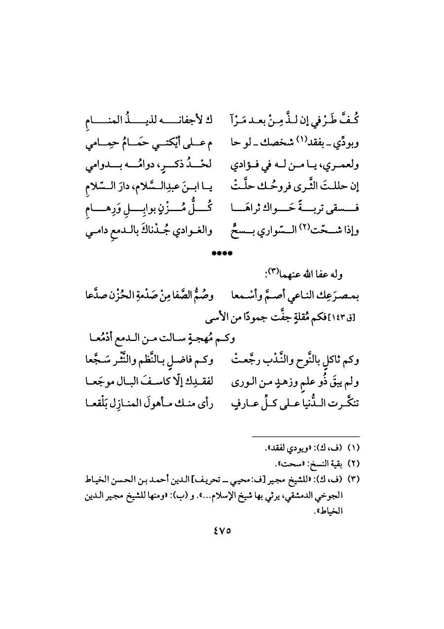 (¬٣) (ف، ك): «للشيخ مجير [ف: محيي ــ تحريف] الدين أحمد بن الحسن الخياط الجوخي الدمشقي، يرثي بها شيخ الإسلام ... ». و (ب): «ومنها للشيخ مجير الدين الخياط».