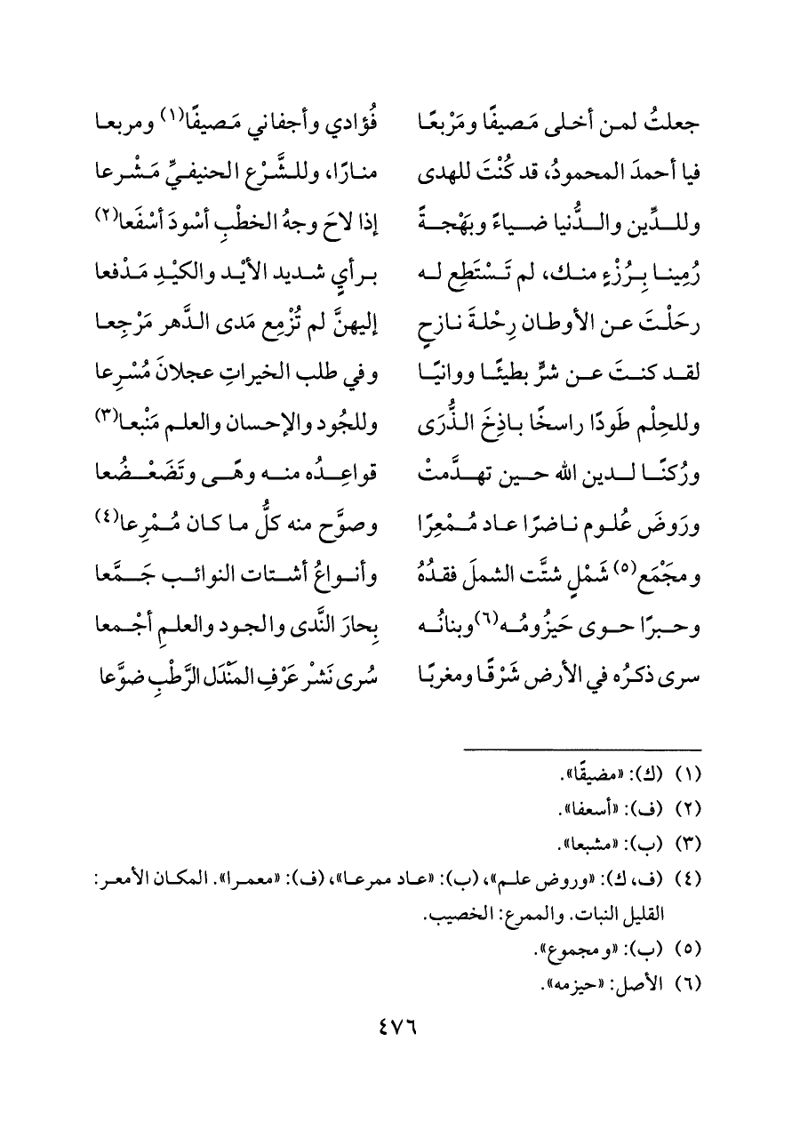 (¬٤) (ف، ك): «وروض علم»، (ب): «عاد ممرعا»، (ف): «معمرا». المكان الأمعر: القليل النبات. والممرع: الخصيب.