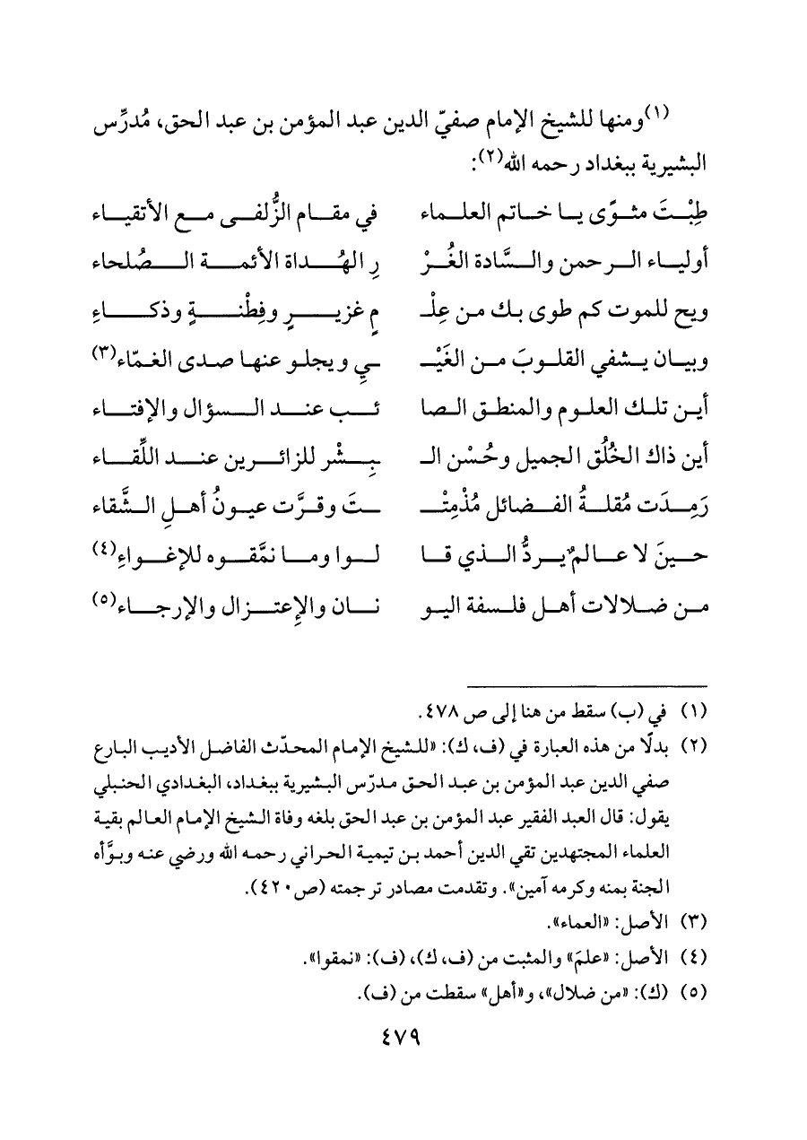 (¬١) ومنها للشيخ الإمام صفيّ الدين عبد المؤمن بن عبد الحق، مُدرِّس البشيرية ببغداد رحمه الله (¬٢):