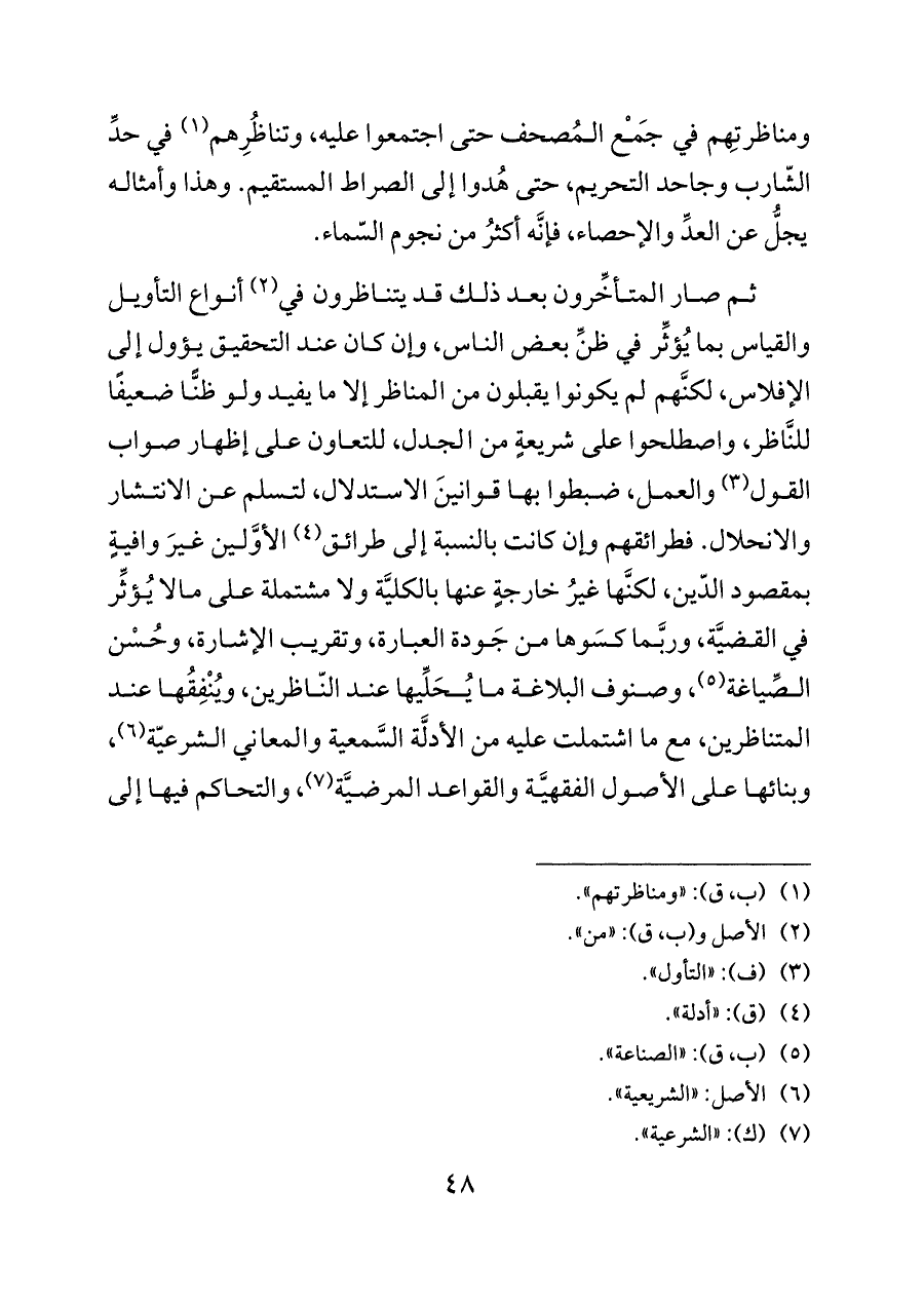 ثم صار المتأخِّرون بعد ذلك قد يتناظرون في (¬٢) أنواع التأويل والقياس بما يُؤثِّر في ظنِّ بعض الناس، وإن كان عند التحقيق يؤول إلى الإفلاس، لكنَّهم لم يكونوا يقبلون من المناظر إلا ما يفيد ولو ظنًّا ضعيفًا للنَّاظر، واصطلحوا على شريعةٍ من الجدل، للتعاون على إظهار صواب القول (¬٣) والعمل، ضبطوا بها قوانينَ الاستدلال، لتسلم عن الانتشار والانحلال. فطرائقهم وإن كانت بالنسبة إلى طرائق (¬٤) الأوَّلين غيرَ وافيةٍ بمقصود الدّين، لكنَّها غيرُ خارجةٍ عنها بالكليَّة ولا مشتملة على مالا يُؤثِّر في القضيَّة، وربَّما كسَوها من جَودة العبارة، وتقريب الإشارة، وحُسْن الصِّياغة (¬٥)، وصنوف البلاغة ما يُحَلِّيها عند النّاظرين، ويُنْفِقُها عند المتناظرين، مع ما اشتملت عليه من الأدلَّة السَّمعية والمعاني الشرعيّة (¬٦)، وبنائها على الأصول الفقهيَّة والقواعد المرضيَّة (¬٧)، والتحاكم فيها إلى