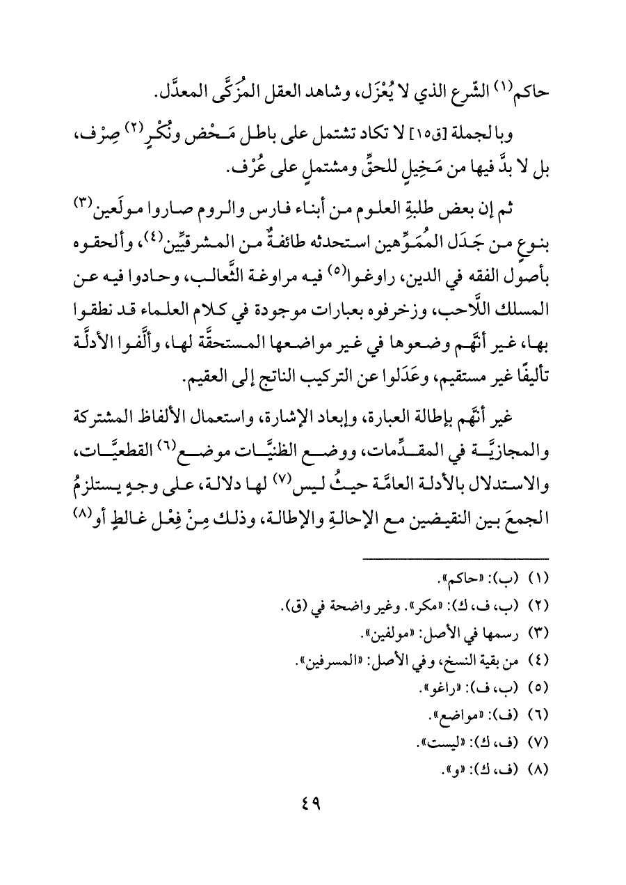 ثم إن بعض طلبةِ العلوم من أبناء فارس والروم صاروا مولَعين (¬٣) بنوعٍ من جَدَل المُمَوِّهين استحدثه طائفةٌ من المشرقيِّين (¬٤)، وألحقوه بأصول الفقه في الدين، راوغوا (¬٥) فيه مراوغة الثَّعالب، وحادوا فيه عن المسلك اللَّاحب، وزخرفوه بعبارات موجودة في كلام العلماء قد نطقوا بها، غير أنَّهم وضعوها في غير مواضعها المستحقَّة لها، وألَّفوا الأدلَّة تأليفًا غير مستقيم، وعَدَلوا عن التركيب الناتج إلى العقيم.