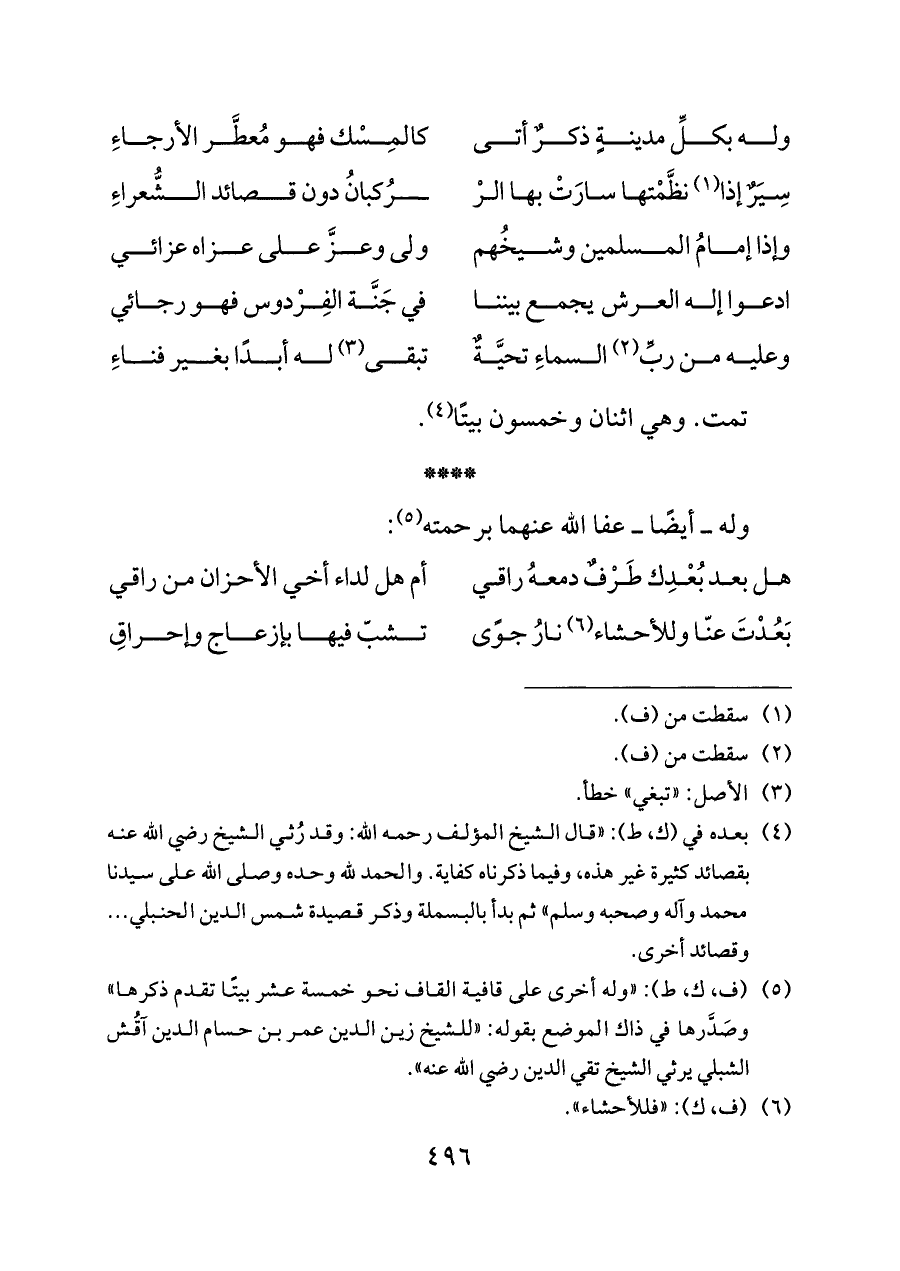 (¬٤) بعده في (ك، ط): «قال الشيخ المؤلف رحمه الله: وقد رُثي الشيخ رضي الله عنه بقصائد كثيرة غير هذه، وفيما ذكرناه كفاية. والحمد لله وحده وصلى الله على سيدنا محمد وآله وصحبه وسلم» ثم بدأ بالبسملة وذكر قصيدة شمس الدين الحنبلي ... وقصائد أخرى.