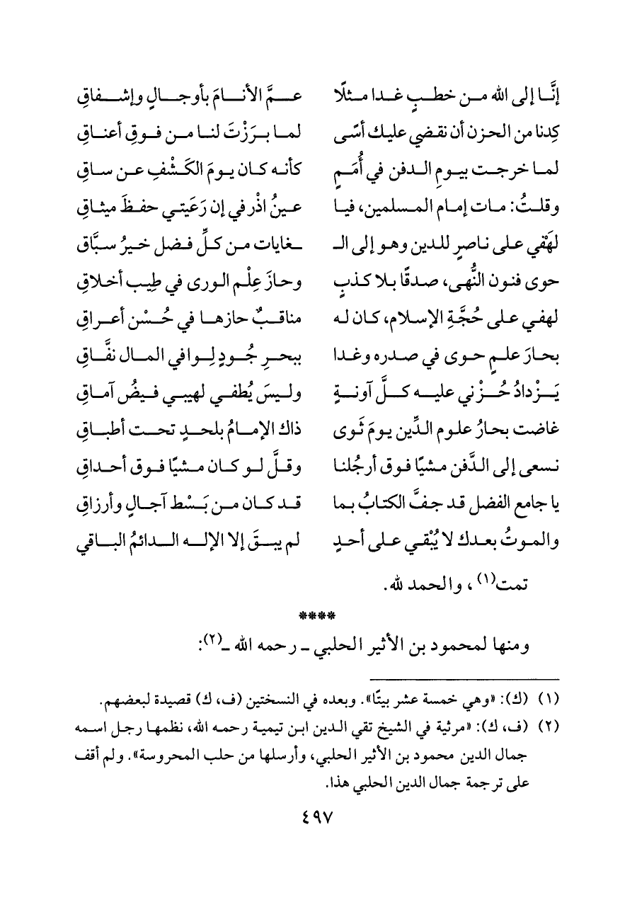 (¬٢) (ف، ك): «مرثية في الشيخ تقي الدين ابن تيمية رحمه الله، نظمها رجل اسمه جمال الدين محمود بن الأثير الحلبي، وأرسلها من حلب المحروسة». ولم أقف على ترجمة جمال الدين الحلبي هذا.