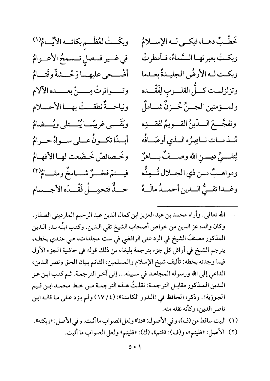 خَطْبٌ دها، فبكى له الإسلامُ ... وبكَتْ لعُظْمِ بكائه الأيَّامُ (¬١)