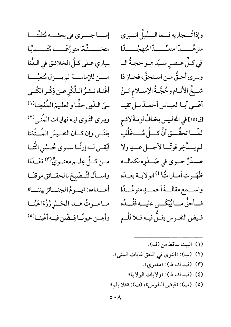 [ق ١٥٤] في الله ليس يخافُ لومةَ لائمٍ ... ويرى التّوى فيه نهايات المُنى (¬٢)