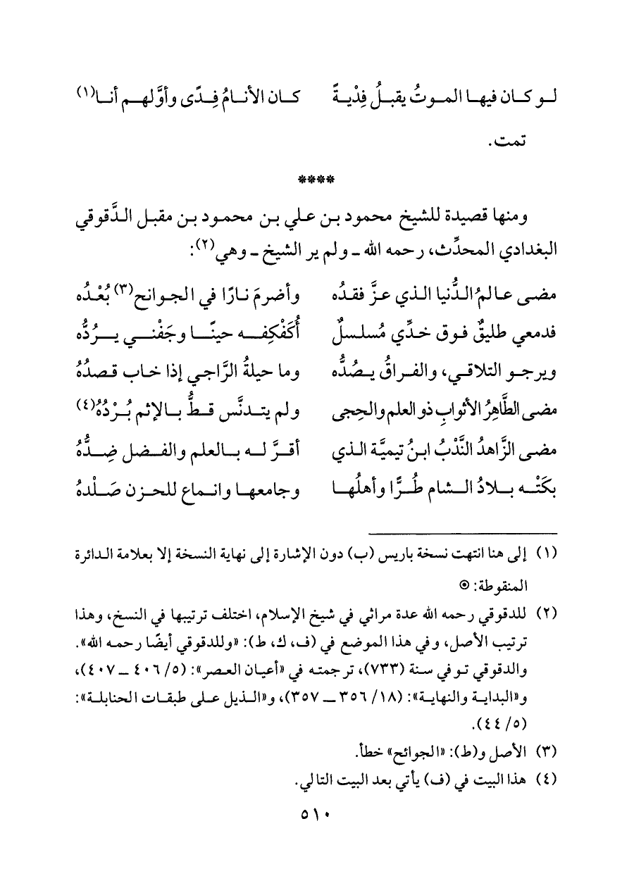 (¬٢) للدقوقي رحمه الله عدة مراثي في شيخ الإسلام، اختلف ترتيبها في النسخ، وهذا ترتيب الأصل، وفي هذا الموضع في (ف، ك، ط): «وللدقوقي أيضًا رحمه الله». والدقوقي توفي سنة (٧٣٣)، ترجمته في «أعيان العصر»: (٥/ ٤٠٦ ــ ٤٠٧)، و «البداية والنهاية»: (١٨/ ٣٥٦ ــ ٣٥٧)، و «الذيل على طبقات الحنابلة»: (٥/ ٤٤).