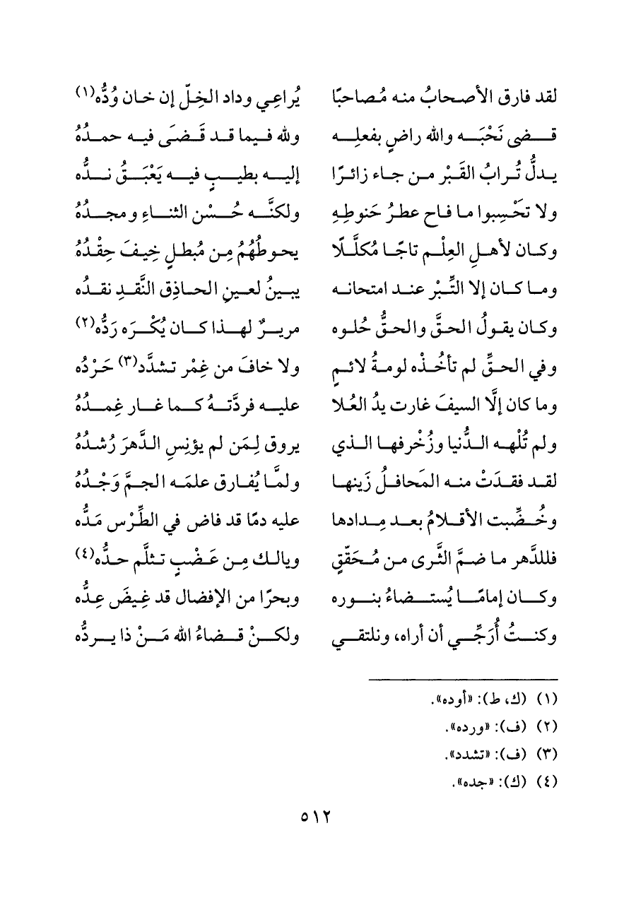 لقد فارق الأصحابُ منه مُصاحبًا ... يُراعِي وداد الخِلّ إن خان وُدُّه (¬١)