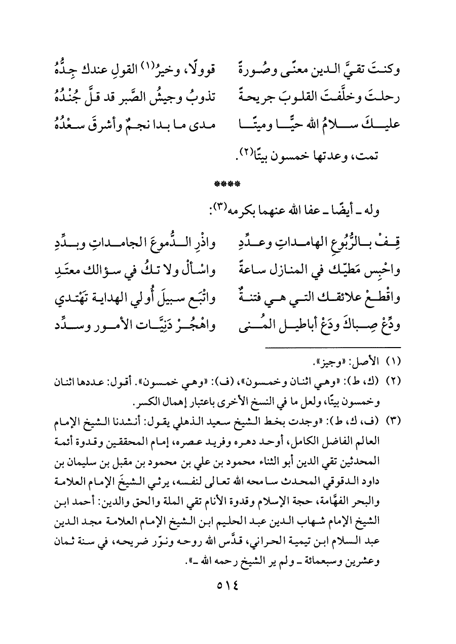 (¬٣) (ف، ك، ط): «وجدت بخط الشيخ سعيد الذهلي يقول: أنشدنا الشيخ الإمام العالم الفاضل الكامل، أوحد دهره وفريد عصره، إمام المحققين وقدوة أئمة المحدثين تقي الدين أبو الثناء محمود بن علي بن محمود بن مقبل بن سليمان بن داود الدقوقي المحدث سامحه الله تعالى لنفسه، يرثي الشيخَ الإمام العلامة والبحر الفهَّامة، حجة الإسلام وقدوة الأنام تقي الملة والحق والدين: أحمد ابن الشيخ الإمام شهاب الدين عبد الحليم ابن الشيخ الإمام العلامة مجد الدين عبد السلام ابن تيمية الحراني، قدَّس الله روحه ونوّر ضريحه، في سنة ثمان وعشرين وسبعمائة ــ ولم ير الشيخ رحمه الله ــ».