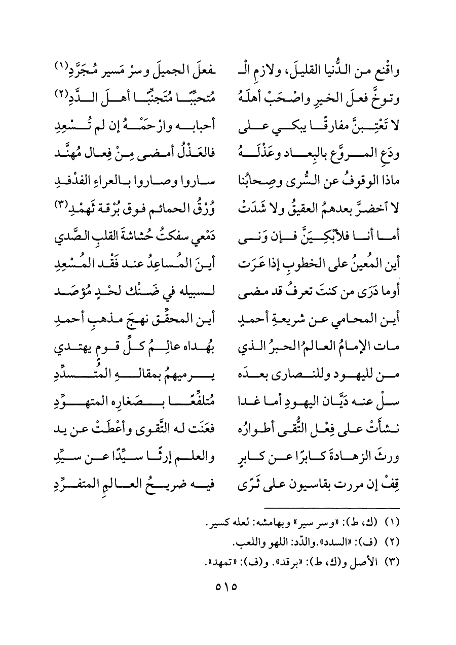 واقْنع من الدُّنيا القليلَ، ولازمِ الْـ ... ـفعلَ الجميلَ وسرْ مَسير مُجَرَّدِ (¬١)