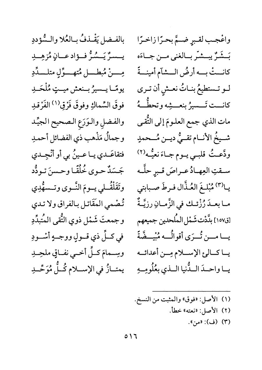 واعْجب لقبرٍ ضمَّ بحرًا زاخرًا ... بالفضل يَقْذفُ بالعُلا والسُّؤدد