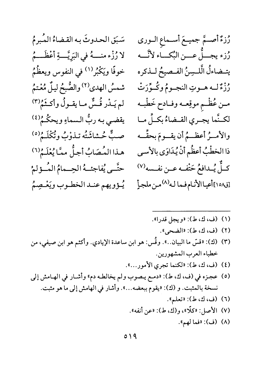 (¬٣) (ك): «قسّ ما البيان .. ». وقُس: هو ابن ساعدة الإيادي. وأكثم هو ابن صيفي، من خطباء العرب المشهورين.