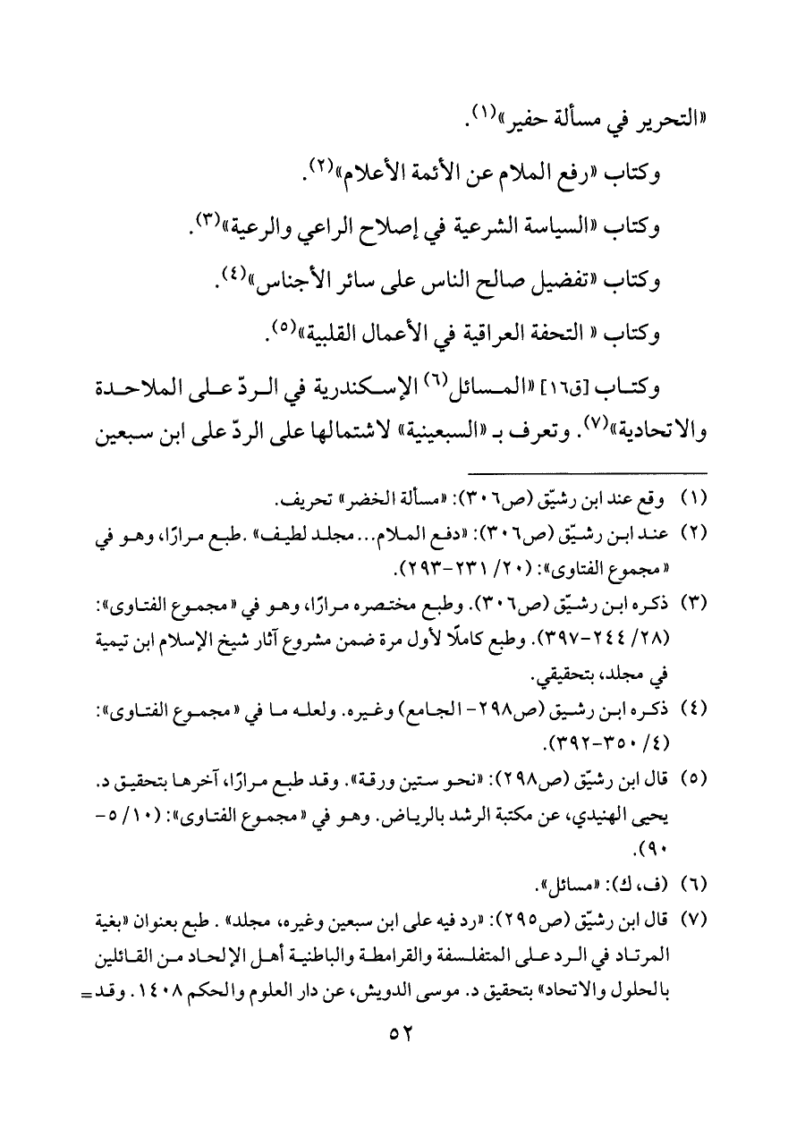 (¬٥) قال ابن رشيّق (ص ٢٩٨): «نحو ستين ورقة». وقد طبع مرارًا، آخرها بتحقيق د. يحيى الهنيدي، عن مكتبة الرشد بالرياض. وهو في «مجموع الفتاوى»: (١٠/ ٥ - ٩٠).