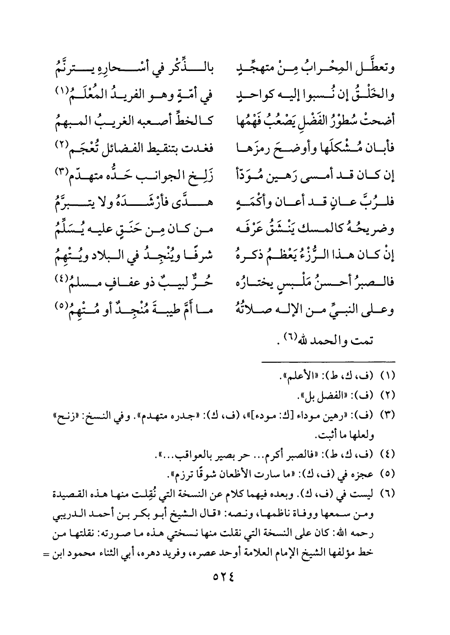 (¬٦) ليست في (ف، ك). وبعده فيهما كلام عن النسخة التي نُقِلت منها هذه القصيدة ومن سمعها ووفاة ناظمها، ونصه: «قال الشيخ أبو بكر بن أحمد الدريبي رحمه الله: كان على النسخة التي نقلت منها نسختي هذه ما صورته: نقلتها من خط مؤلفها الشيخ الإمام العلامة أوحد عصره، وفريد دهره، أبي الثناء محمود ابن علي بن محمود الدقوقي البغدادي قدَّس الله روحه.