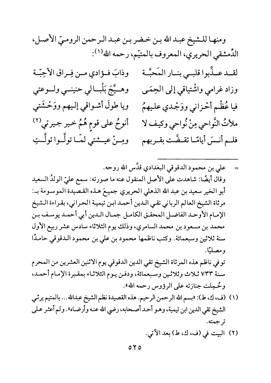 (¬١) (ف، ك، ط): «بسم الله الرحمن الرحيم. هذه القصيدة نظم الشيخ عبدالله ... بالمتيم يرثي الشيخ تقي الدين ابن تيمية، وهو أحد أصحابه، رضي الله عنه وأرضاه». ولم أعثر على ترجمته.