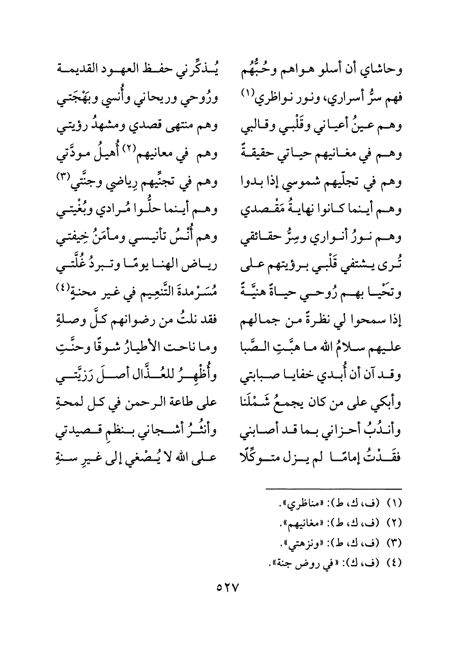 فهم سرُّ أسراري، ونور نواظري (¬١) ... ورُوحي وريحاني وأُنسي وبَهْجَتي ... أتى