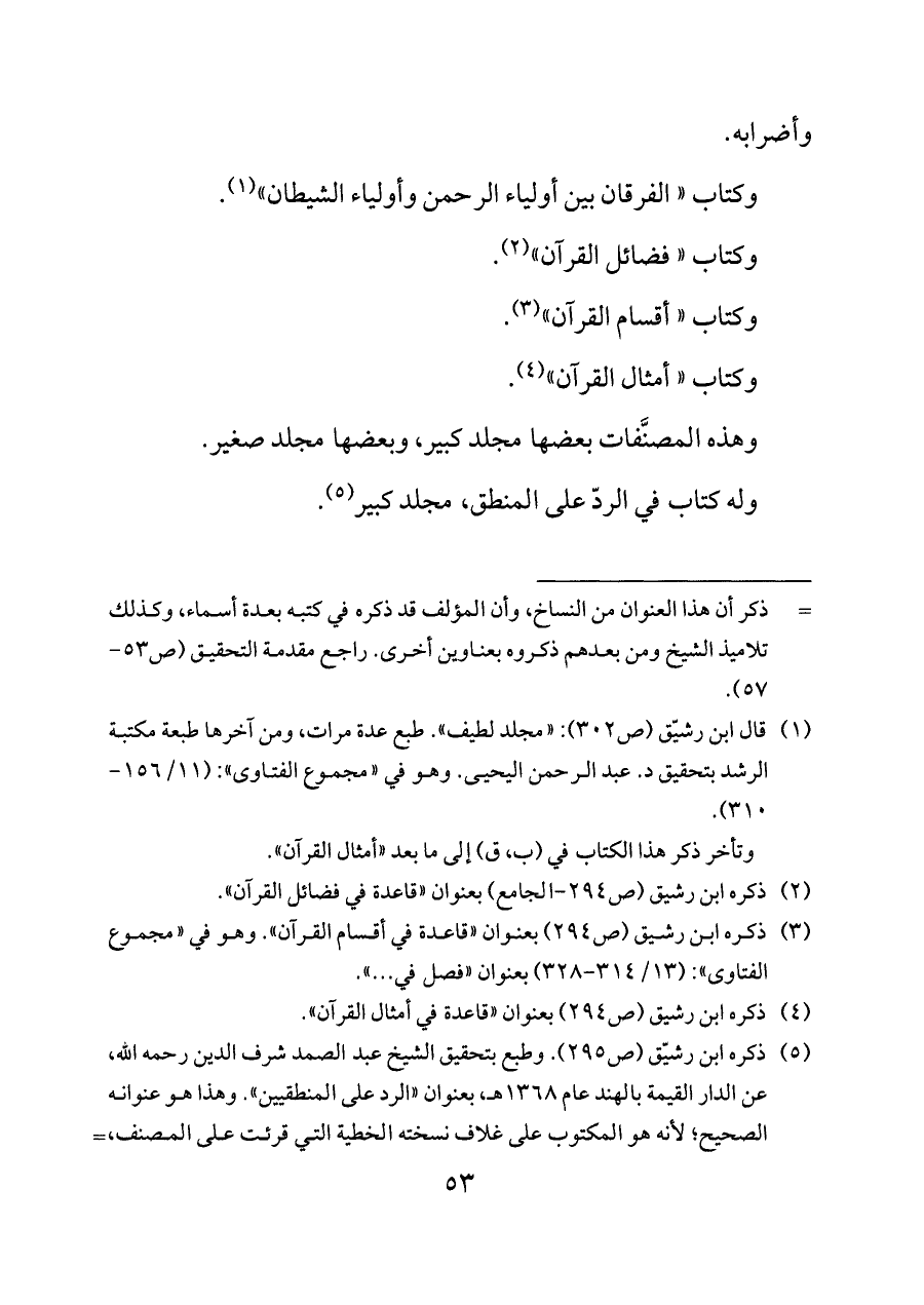 (¬٥) ذكره ابن رشيّق (ص ٢٩٥). وطبع بتحقيق الشيخ عبد الصمد شرف الدين رحمه الله، عن الدار القيمة بالهند عام ١٣٦٨ هـ، بعنوان «الرد على المنطقيين». وهذا هو عنوانه الصحيح؛ لأنه هو المكتوب على غلاف نسخته الخطية التي قرئت على المصنف، وعليها خطه في مواضع عديدة. ويسمى أيضًا «نصيحة أهل الإيمان في الرد على منطق القرآن» وقد لخصه السيوطي وطبع تلخيصه في «مجموع الفتاوى»: (٩/ ٨٢ - ٢٥٤).