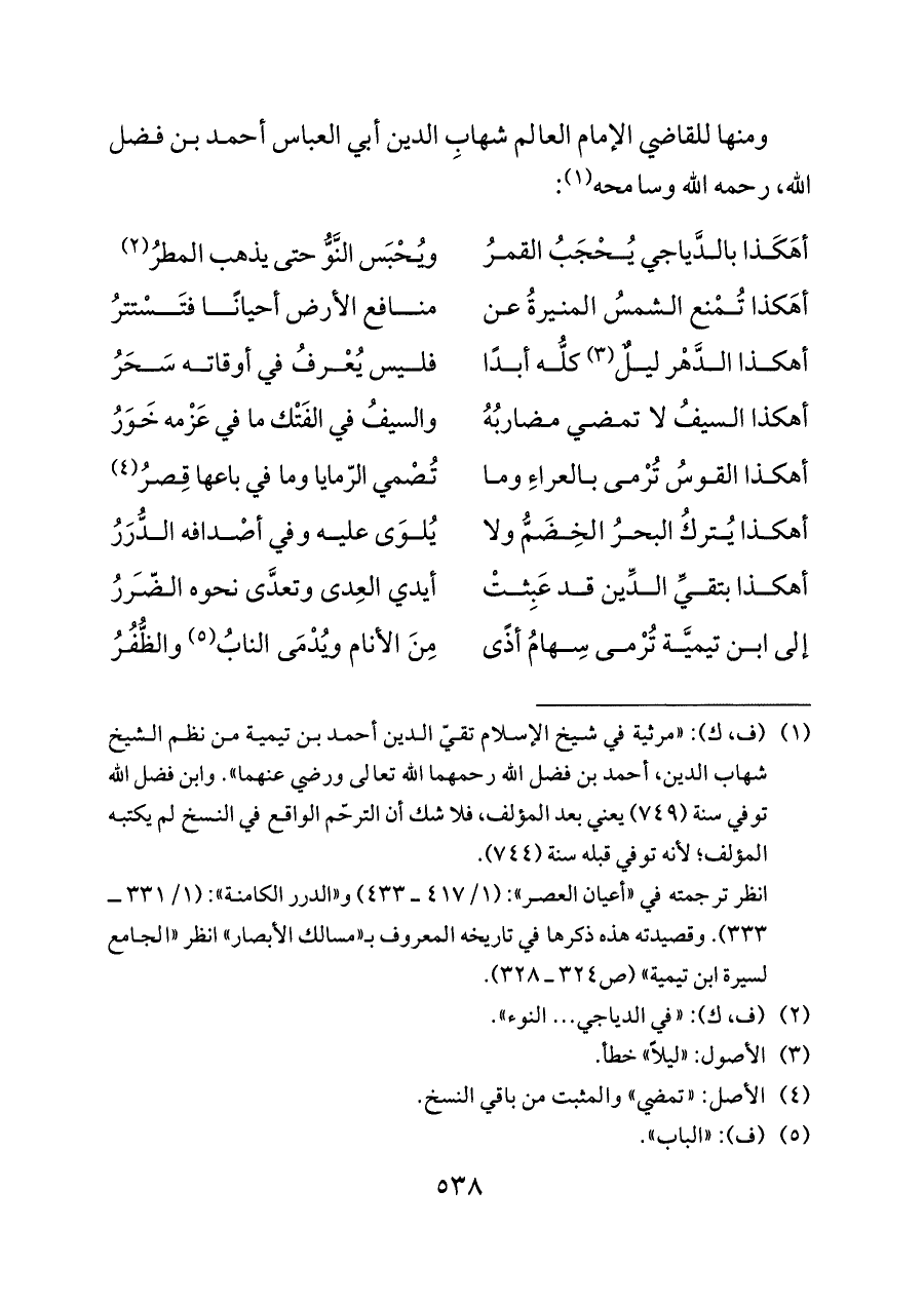 (¬١) (ف، ك): «مرثية في شيخ الإسلام تقيّ الدين أحمد بن تيمية من نظم الشيخ شهاب الدين، أحمد بن فضل الله رحمهما الله تعالى ورضي عنهما». وابن فضل الله توفي سنة (٧٤٩) يعني بعد المؤلف، فلا شك أن الترحّم الواقع في النسخ لم يكتبه المؤلف؛ لأنه توفي قبله سنة (٧٤٤).