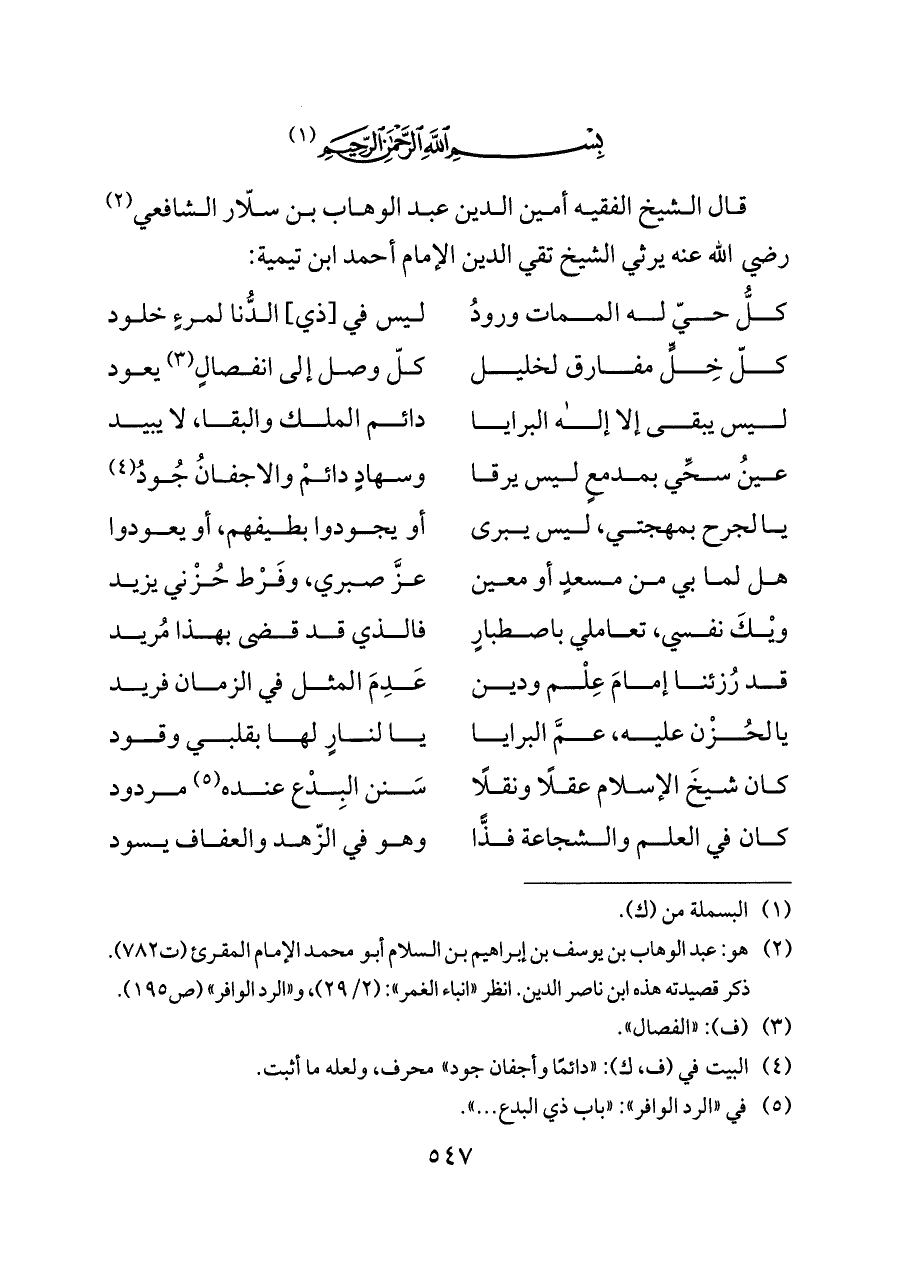 (¬٢) هو: عبد الوهاب بن يوسف بن إبراهيم بن السلام أبو محمد الإمام المقرئ (ت ٧٨٢). ذكر قصيدته هذه ابن ناصر الدين. انظر «انباء الغمر»: (٢/ ٢٩)، و «الرد الوافر» (ص ١٩٥).
