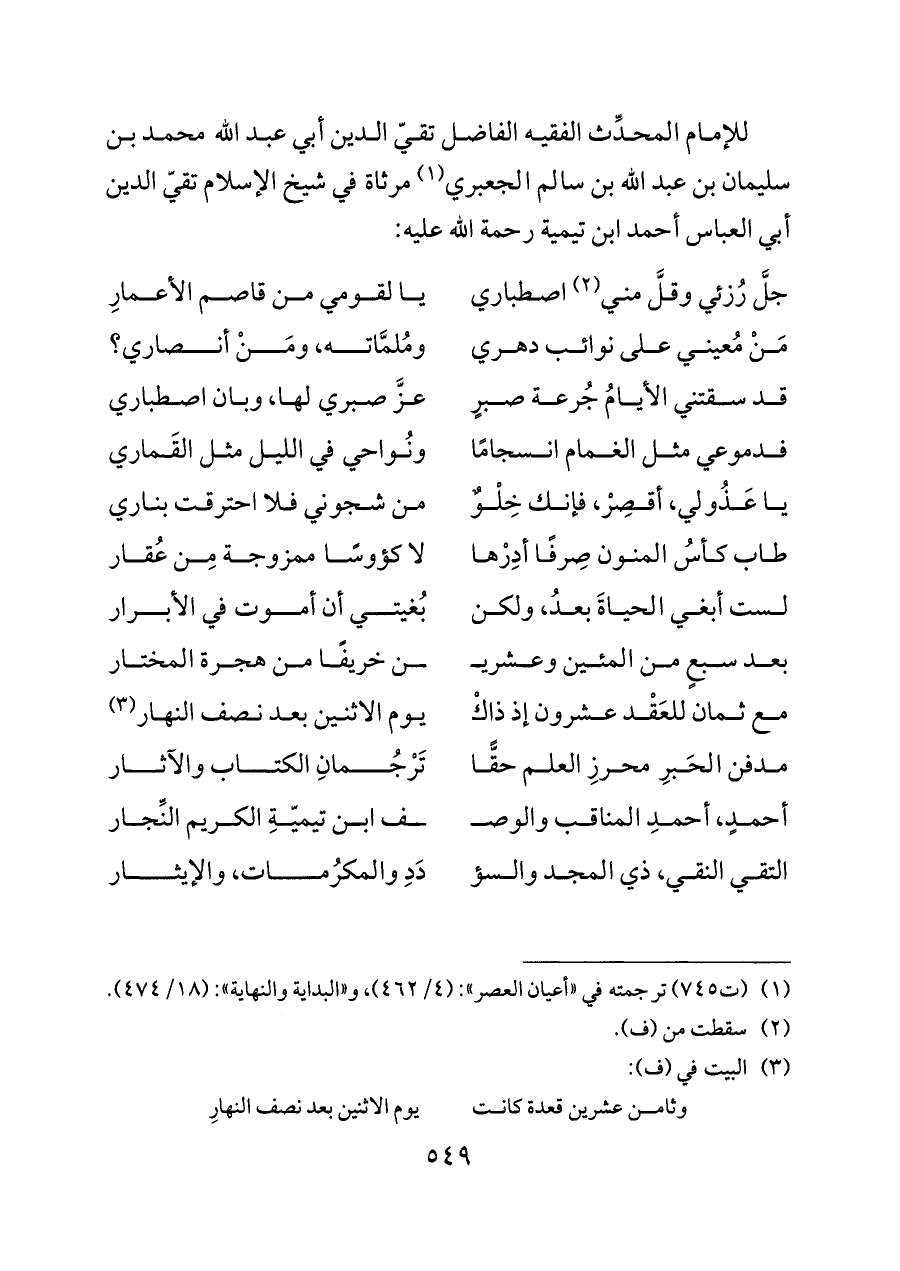 للإمام المحدِّث الفقيه الفاضل تقيّ الدين أبي عبد الله محمد بن سليمان بن عبد الله بن سالم الجعبري (¬١) مرثاة في شيخ الإسلام تقيّ الدين أبي العباس أحمد ابن تيمية رحمة الله عليه: