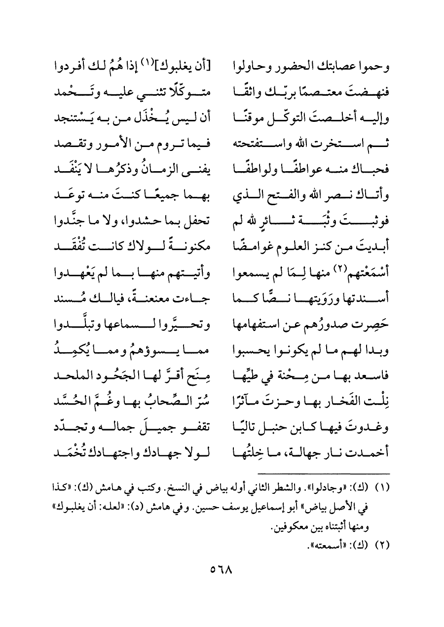 (¬١) (ك): «وجادلوا». والشطر الثاني أوله بياض في النسخ. وكتب في هامش (ك): «كذا في الأصل بياض» أبو إسماعيل يوسف حسين. وفي هامش (د): «لعله: أن يغلبوك» ومنها أثبتناه بين معكوفين.