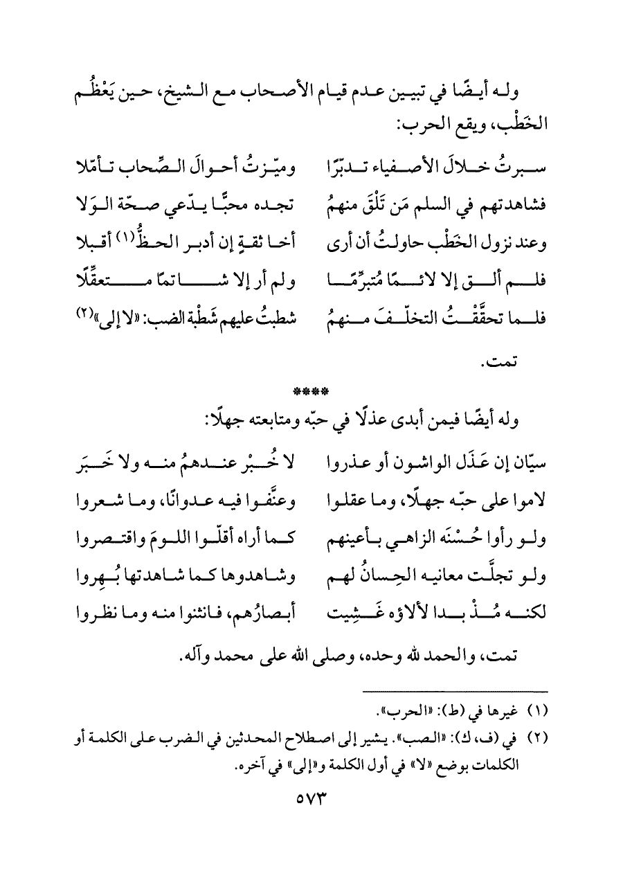وله أيضًا في تبيين عدم قيام الأصحاب مع الشيخ، حين يَعْظُم الخَطْب، ويقع الحرب:
