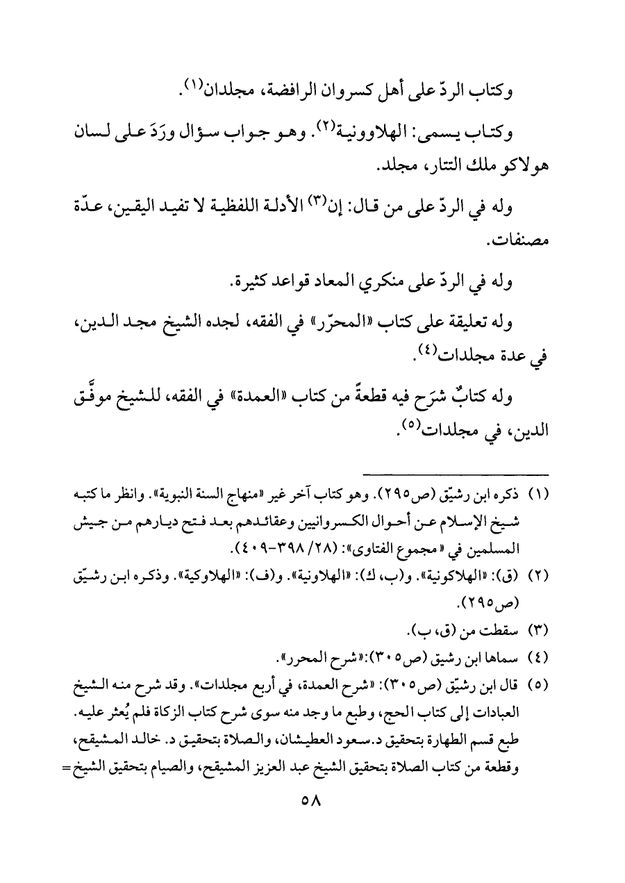 (¬١) ذكره ابن رشيّق (ص ٢٩٥). وهو كتاب آخر غير «منهاج السنة النبوية». وانظر ما كتبه شيخ الإسلام عن أحوال الكسروانيين وعقائدهم بعد فتح ديارهم من جيش المسلمين في «مجموع الفتاوى»: (٢٨/ ٣٩٨ - ٤٠٩).