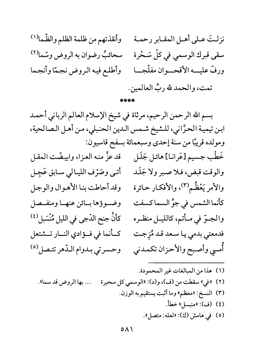 بسم الله الرحمن الرحيم، مرثاة في شيخ الإسلام العالم الرباني أحمد ابن تيمية الحرَّاني، للشيخ شمس الدين الحنبلي، من أهل الصالحية، ومولده قريبًا من سنة إحدى وسبعمائة بسفح قاسيون: