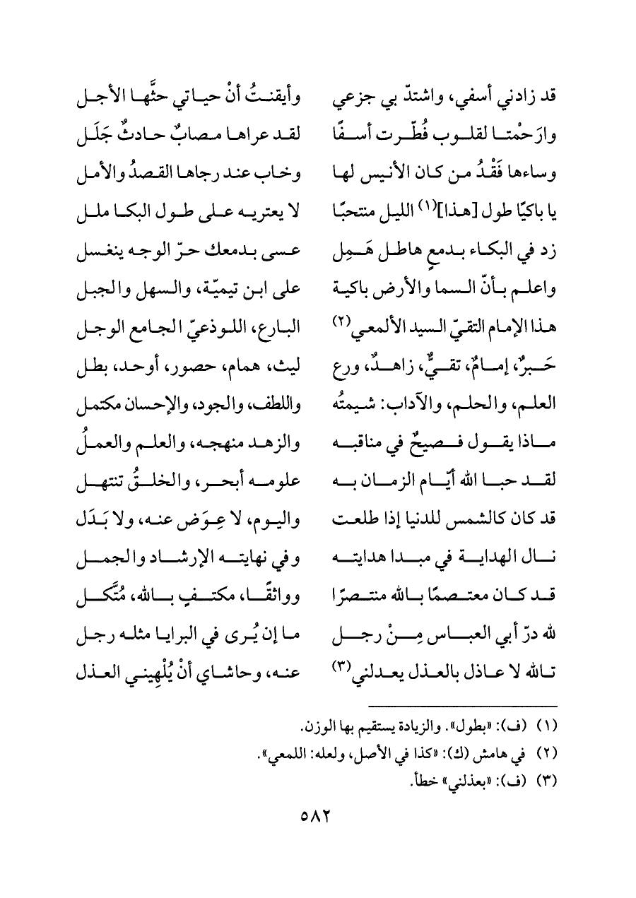 قد زادني أسفي، واشتدّ بي جزعي ... وأيقنتُ أنْ حياتي حثَّها الأجل