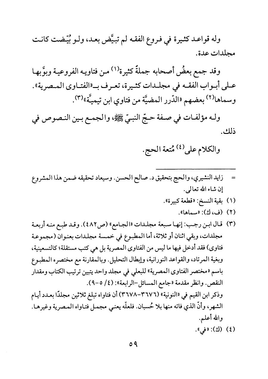 (¬٣) قال ابن رجب: إنها سبعة مجلدات «الجامع» (ص ٤٨٢). وقد طبع منه أربعة مجلدات، وبقي اثنان أو ثلاثة، أما المطبوع في خمسة مجلدات بعنوان (مجموعة فتاوى) فقد أدخل فيها ما ليس من الفتاوى المصرية بل هي كتب مستقلة؛ كالتسعينية، وبغية المرتاد، والقواعد النورانية، وإبطال التحليل. وبالمقارنة مع مختصره المطبوع باسم «مختصر الفتاوى المصرية» للبعلي في مجلد واحد يتبين ترتيب الكتاب ومقدار النقص. وانظر مقدمة «جامع المسائل-الرابعة»: (٤/ ٥ - ٩). ...