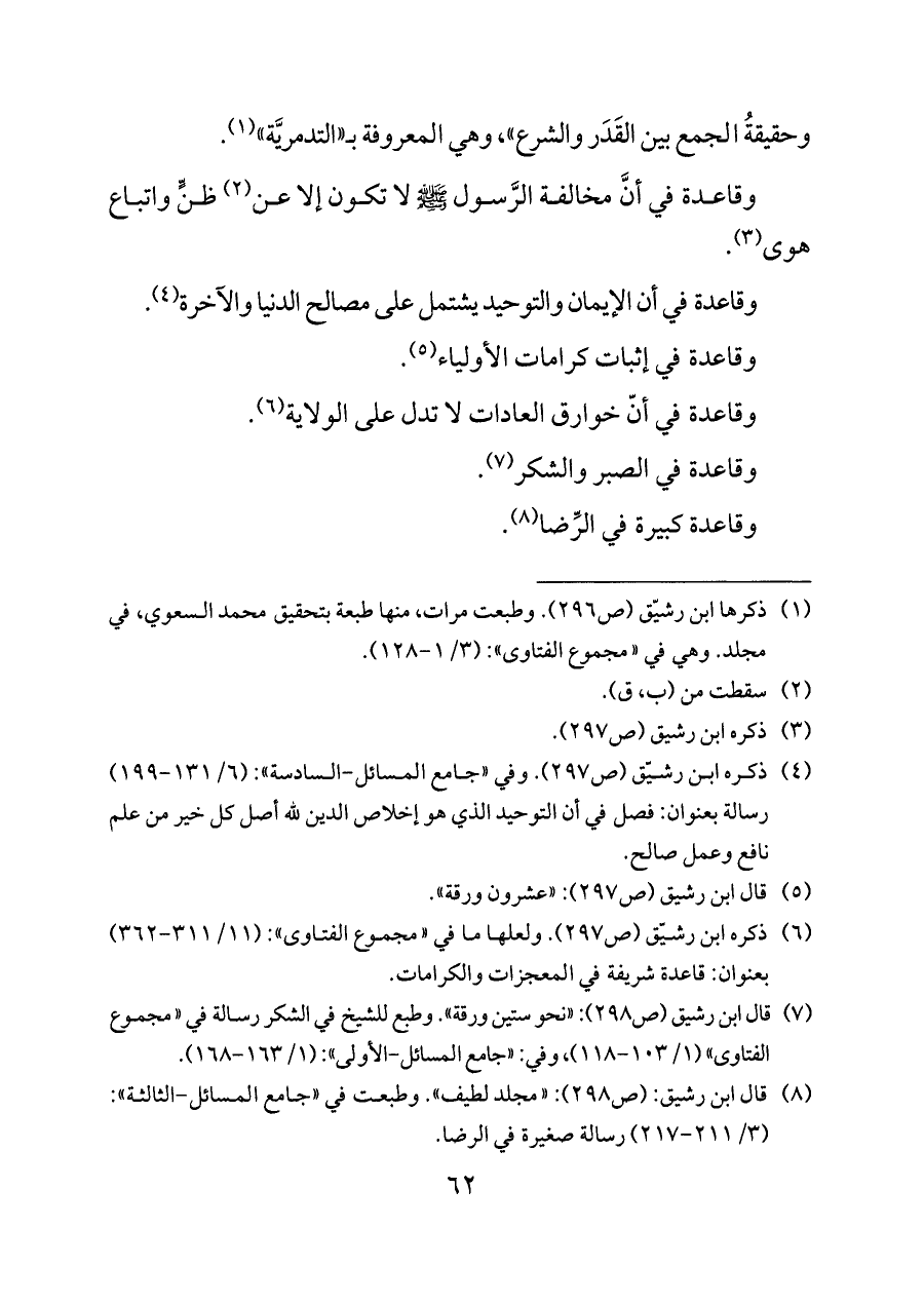 (¬٦) ذكره ابن رشيّق (ص ٢٩٧). ولعلها ما في «مجموع الفتاوى»: (١١/ ٣١١ - ٣٦٢) بعنوان: قاعدة شريفة في المعجزات والكرامات.