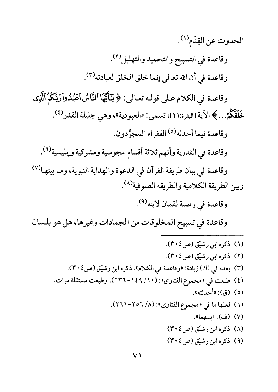 وقاعدة في القدرية وأنهم ثلاثة أقسام مجوسية ومشركية وإبليسية (¬٦).