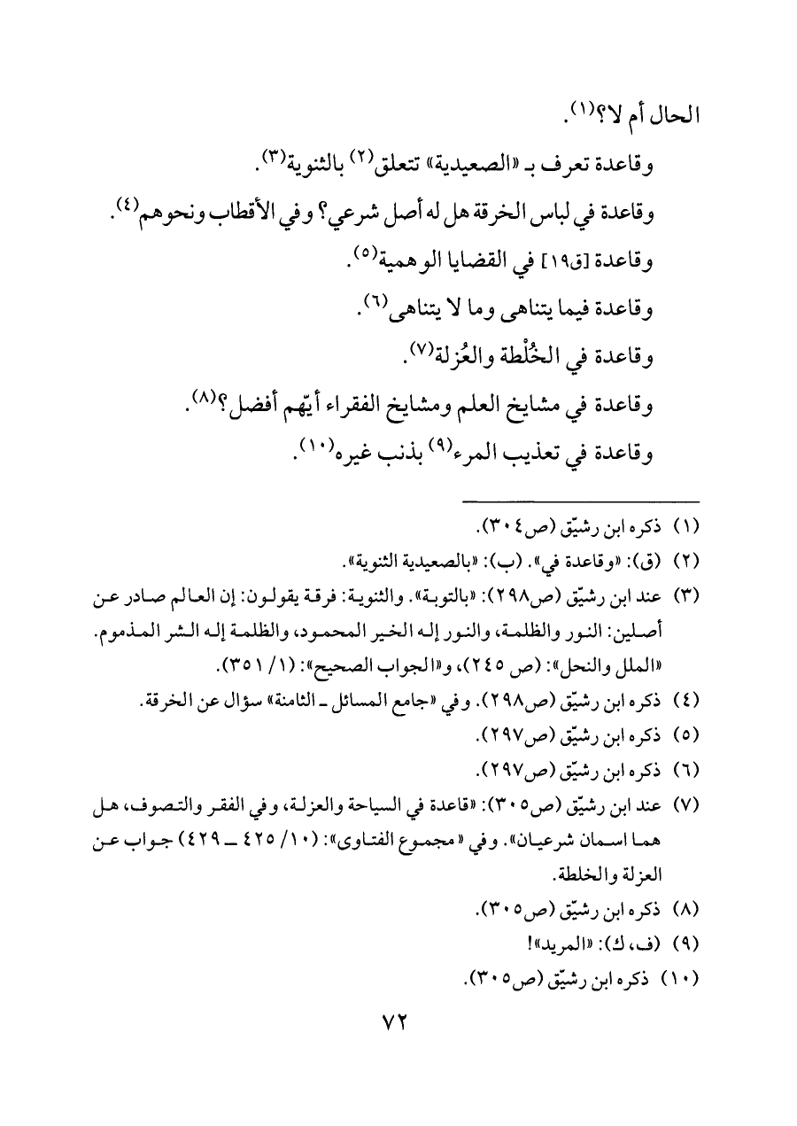 (¬٧) عند ابن رشيّق (ص ٣٠٥): «قاعدة في السياحة والعزلة، وفي الفقر والتصوف، هل هما اسمان شرعيان». وفي «مجموع الفتاوى»: (١٠/ ٤٢٥ ــ ٤٢٩) جواب عن العزلة والخلطة.
