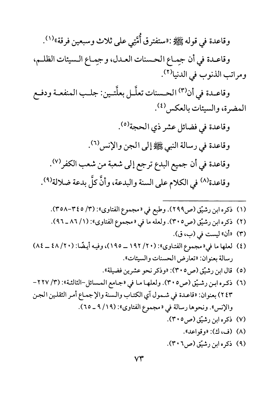 (¬٦) ذكره ابن رشيّق (ص ٣٠٥). ولعلها ما في «جامع المسائل-الثالثة»: (٣/ ٢٢٧ - ٢٤٣) بعنوان: «قاعدة في شمول آي الكتاب والسنة والإجماع أمر الثقلين الجن والإنس». ونحوها رسالة في «مجموع الفتاوى»: (١٩/ ٩ ــ ٦٥).