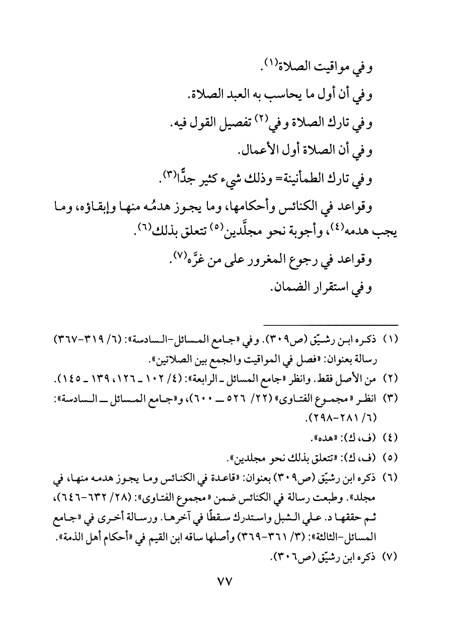 (¬١) ذكره ابن رشيّق (ص ٣٠٩). وفي «جامع المسائل-السادسة»: (٦/ ٣١٩ - ٣٦٧) رسالة بعنوان: «فصل في المواقيت والجمع بين الصلاتين».