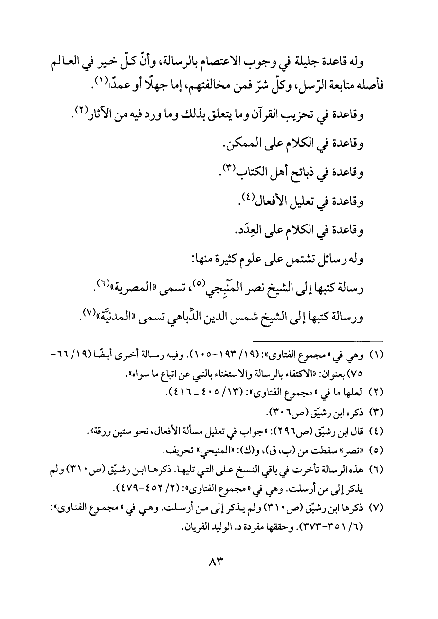 (¬٧) ذكرها ابن رشيّق (ص ٣١٠) ولم يذكر إلى من أرسلت. وهي في «مجموع الفتاوى»: (٦/ ٣٥١ - ٣٧٣). وحققها مفردة د. الوليد الفريان.