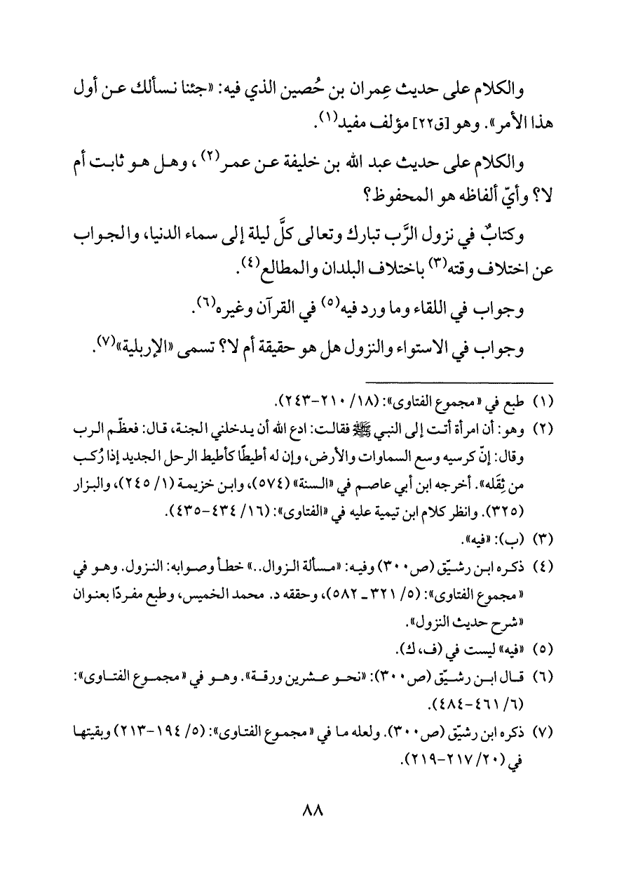 (¬٤) ذكره ابن رشيّق (ص ٣٠٠) وفيه: «مسألة الزوال .. » خطأ وصوابه: النزول. وهو في «مجموع الفتاوى»: (٥/ ٣٢١ ــ ٥٨٢)، وحققه د. محمد الخميس، وطبع مفردًا بعنوان «شرح حديث النزول».
