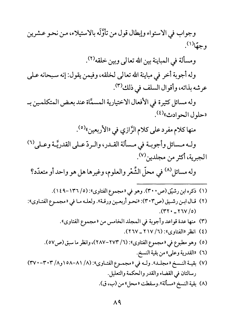 (¬٢) قال ابن رشيق (ص ٣٠٣): «نحو أربعين ورقة». ولعله ما في «مجموع الفتاوى»: (٥/ ٢٦٧ ــ ٣٢٠).