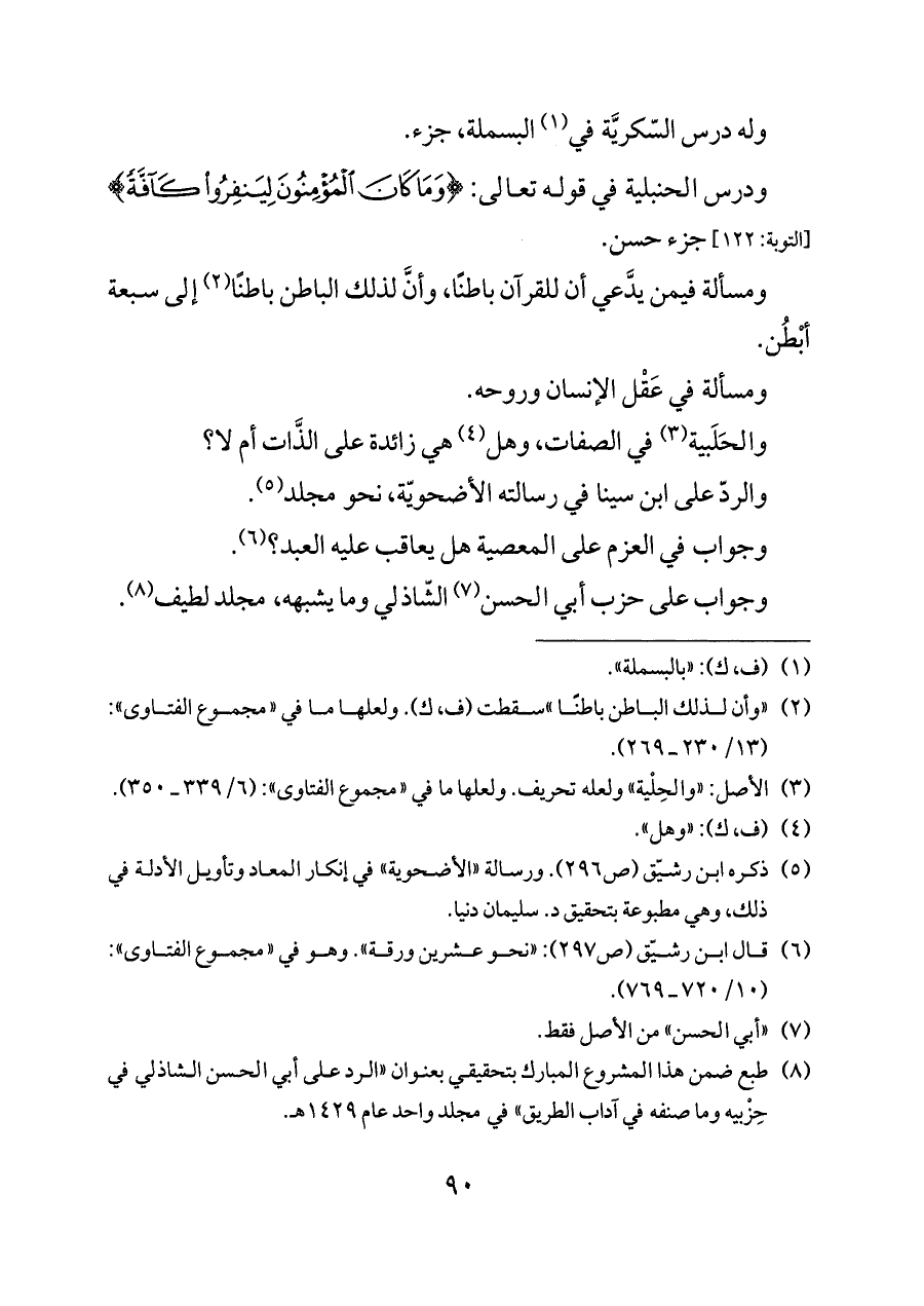 ودرس الحنبلية في قوله تعالى: {وَمَا كَانَ الْمُؤْمِنُونَ لِيَنْفِرُوا كَافَّةً} [التوبة: ١٢٢] جزء حسن.
