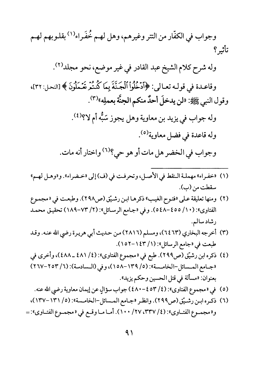 (¬٦) ذكره ابن رشيّق (ص ٢٩٩). وانظر «جامع المسائل-الخامسة»: (٥/ ١٣١ - ١٣٧)، و «مجموع الفتاوى»: (٤/ ٣٣٧، ٢٧/ ١٠٠). أما ما وقع في «مجموع الفتاوى»: (٤/ ٣٣٩) من القول بحياته، فهي فتوى مخالفة لكلام الشيخ المفصَّل في مواضع عدة، ومخالف لما نقله تلاميذه، ومنهم المصنف هنا وابن القيم في «المنار المنيف» (ص ٦٤). ولقطب الدين الخيضري الشافعي (ت ٨٩٤) رسالة في الخضر مخطوطة، وذكر فيها أن بعضهم نقل عن ابن تيمية القول بحياة الخضر، فردّ عليه بأن هذه الفتوى التي نقل منها هذا القائل إنما هي حكاية على لسان من يرى حياته، وليس هو قول الشيخ، وأنه قد تتبع فتاوى ابن تيمية بهذا الخصوص فوجدها متفقة على القول بموته. راجع مقدمة «جامع المسائل- المجموعة الخامسة»: (ص ٨ - ٩).