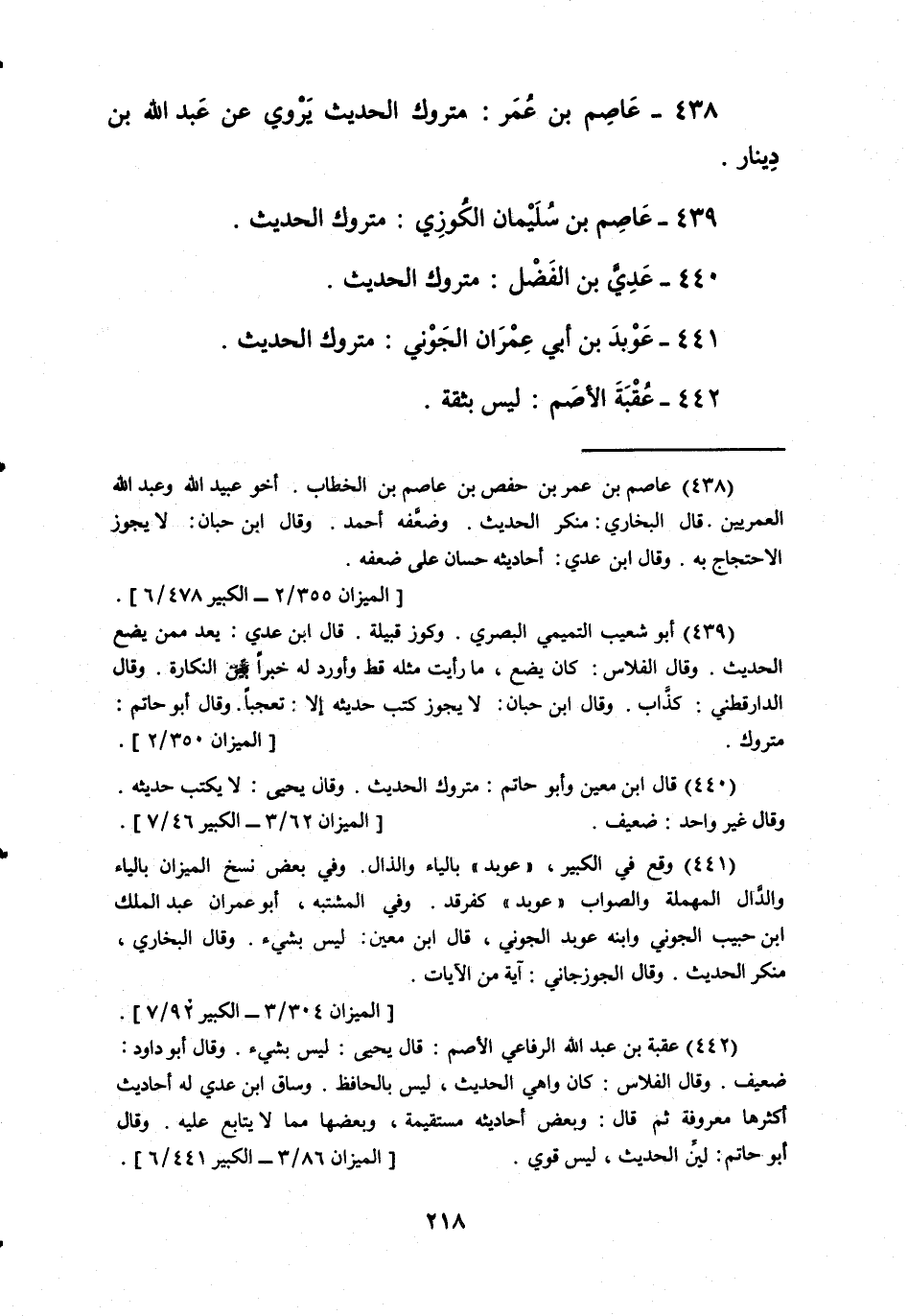 438 - عاصم بن عمر متروك الحديث يروي عن عبد الله بن دينار