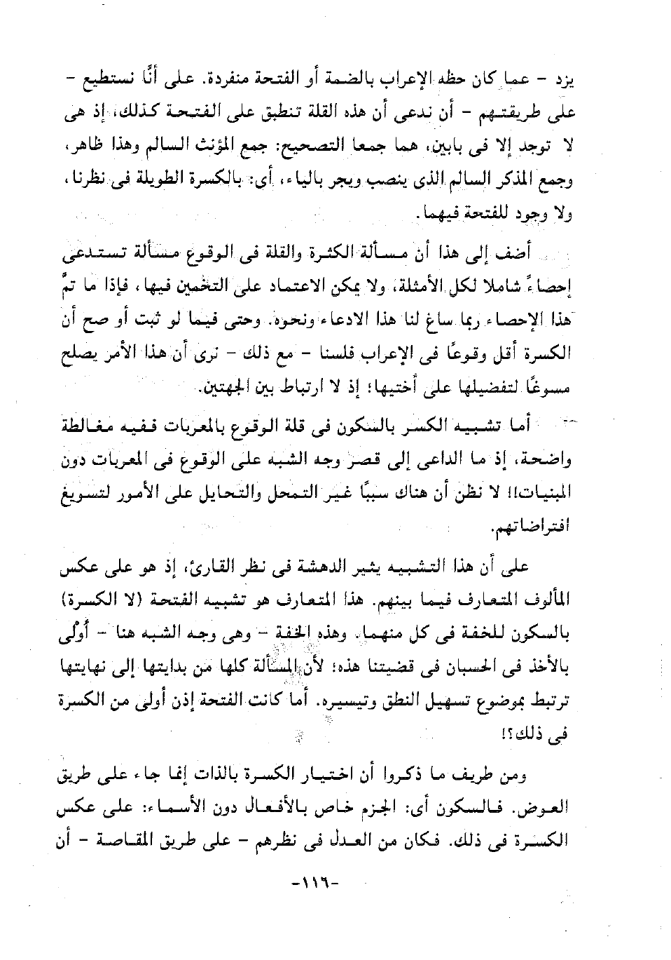 أضف إلى هذا أن مسألة الكثرة والقلة في الوقوع مسألة تستدعي إحصاء شاملا لكل الأمثلة، ولا يمكن الاعتماد على التخمين فيها، فإذا ما تم هذا الإحصاء ربما ساغ لنا هذا الادعاء ونحوه. وحتى فيما لو ثبت أو صح أن الكسرة أقل وقوعا في الإعراب فلسنا -مع ذلك- نرى أن هذا الأمر يصلح مسوغا لتفضيلها على أختيها، إذ لا ارتباط بين الجهتين.