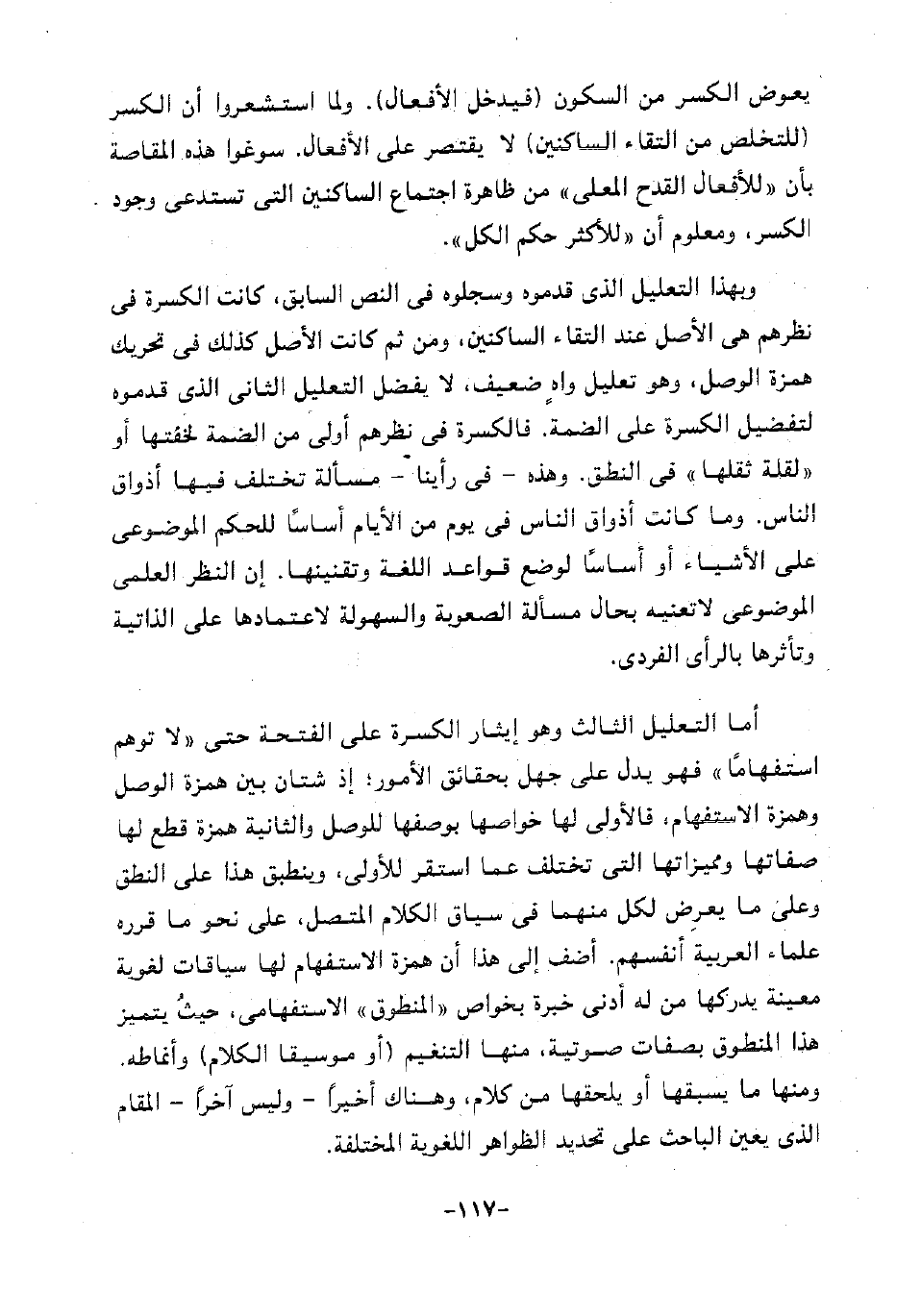 أما التعليل الثالث وهو إيثار الكسرة على الفتحة حتى "لا توهم استفهاما" فهو يدل على جهل بحقائق الأمور، إذ شتان بين همزة الوصل وهمزة الاستفهام، فالأولى لها خواصها بوصفها للوصل والثانية همزة قطع لها صفاتها ومميزاتها التي تختلف عما استقر للأولى، وينطبق هذا على النطق وعلى ما يعرض لكل منهما في سياق الكلام المتصل، على نحو ما قرره علماء العربية أنفسهم. أضف إلى هذا أن همزة الاستفهام لها سياقات لغوية معينة يدركها من له أدنى خبرة بخواص "المنطوق" الاستفهامي، حيث يتميز هذا المنطوق بصفات صوتية، منها التنغيم "أو موسيقا الكلام" وأنماطه. ومنها ما يسبقها أو يلحقها من كلام، وهناك أخيرا -وليس آخرا- المقام الذي يعين الباحث على تحديد الظواهر اللغوية المختلفة.