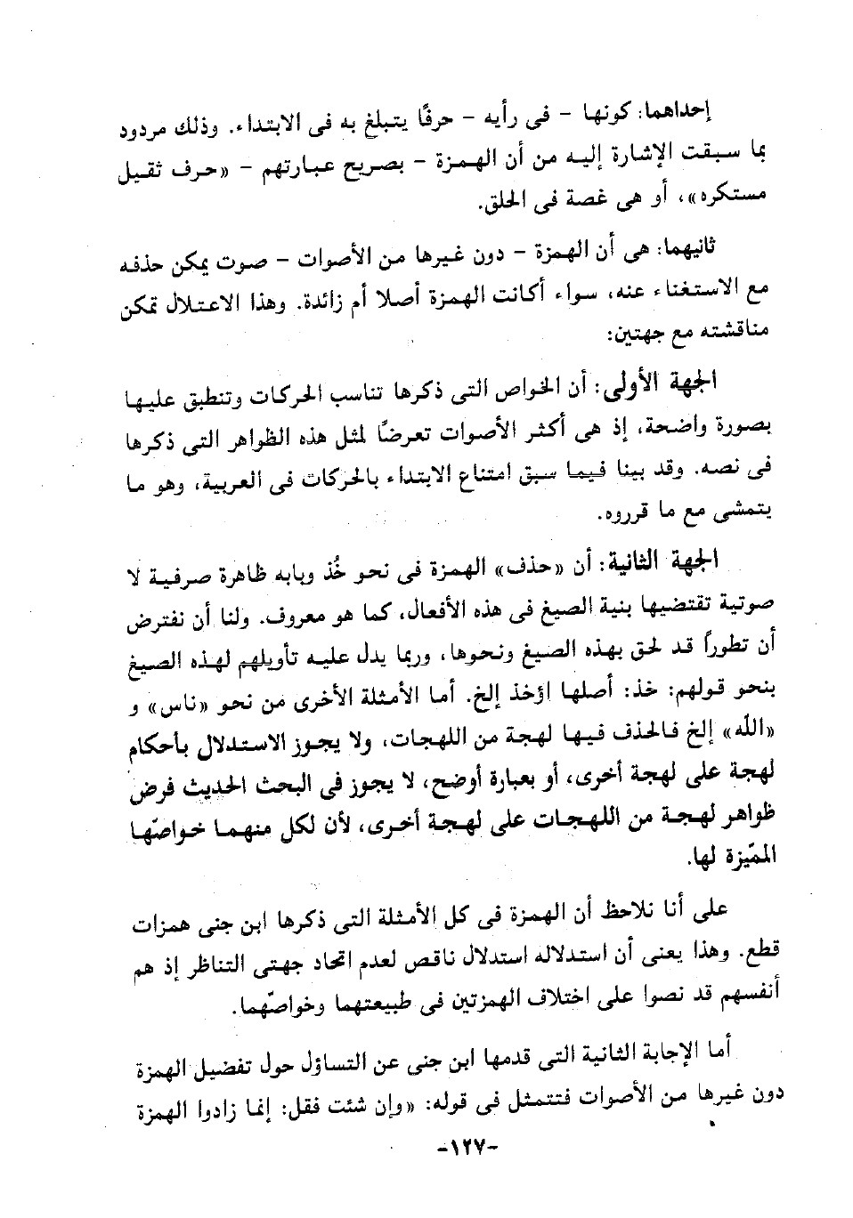 الجهة الثانية: أن "حذف" الهمزة في نحو خذ وبابه ظاهرة صرفية لا صوتية تقتضيها بنية الصيغ في هذه الأفعال، كما هو معروف. ولنا أن نفترض أن تطورًا قد لحق بهذه الصيغ ونحوها، وربما يدل عليه تأويلهم لهذه الصيغ بنحو قولهم: خذ: أصلها أؤخذ إلخ. أما الأمثلة الأخرى من نحو "ناس" و"الله" إلخ فالحذف فيها لهجة من اللهجات، ولا يجوز الاستدلال بأحكام لهجة على لهجة أخرى، أو بعبارة أوضح، لا يجوز في البحث الحديث فرض ظواهر لهجة من اللهجات على لهجة أخرى، لأن لكل منهما خواصها المميزة لها.