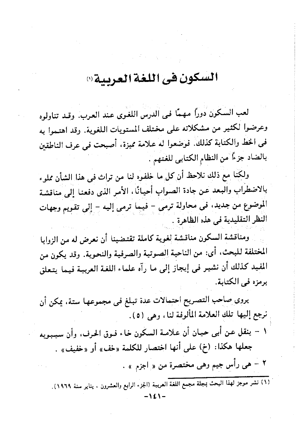 ومناقشة السكون مناقشة لغوية كاملة تقتضينا أن نعرض له من الزوايا المختلفة للبحث، أي: من الناحية الصوتية والصرفية والنحوية. وقد يكون من المفيد كذلك أن نشير في إيجاز إلى ما رآه علماء اللغة العربية فيما يتعلق برمزه في الكتابة.